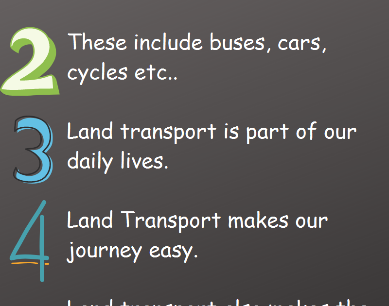 5 Lines on Land Transport Land transport refers to the transportation of humans and material things on the land. Land transport happens either on-road or. So we did some charts.